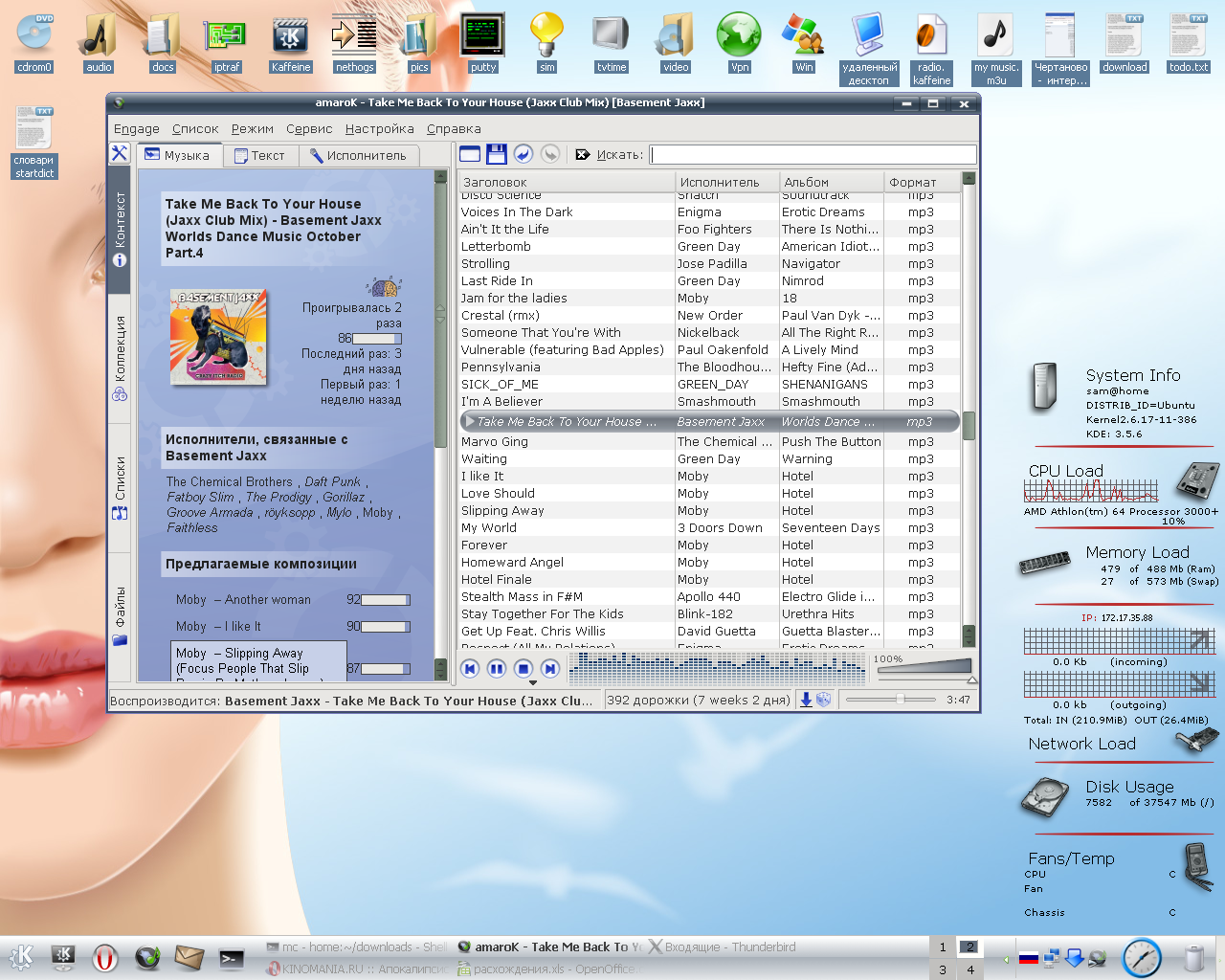В трее kkbswitch, styleclock, knemo, kget, amarok